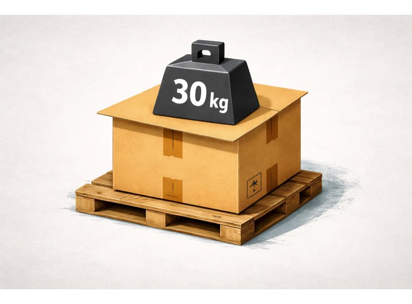 Bei gleicher Materialqualität kann ein größerer Karton deutlich geringere Stapelfähigkeit aufweisen.